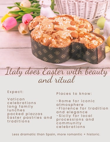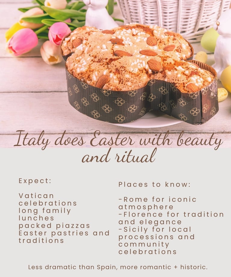 In Spain, Easter is known for powerful Holy Week processions in cities like Seville and Málaga. In Italy, destinations like Rome, Florence, and Sicily offer a more elegant and meaningful Easter atmosphere shaped by history, food, and tradition.